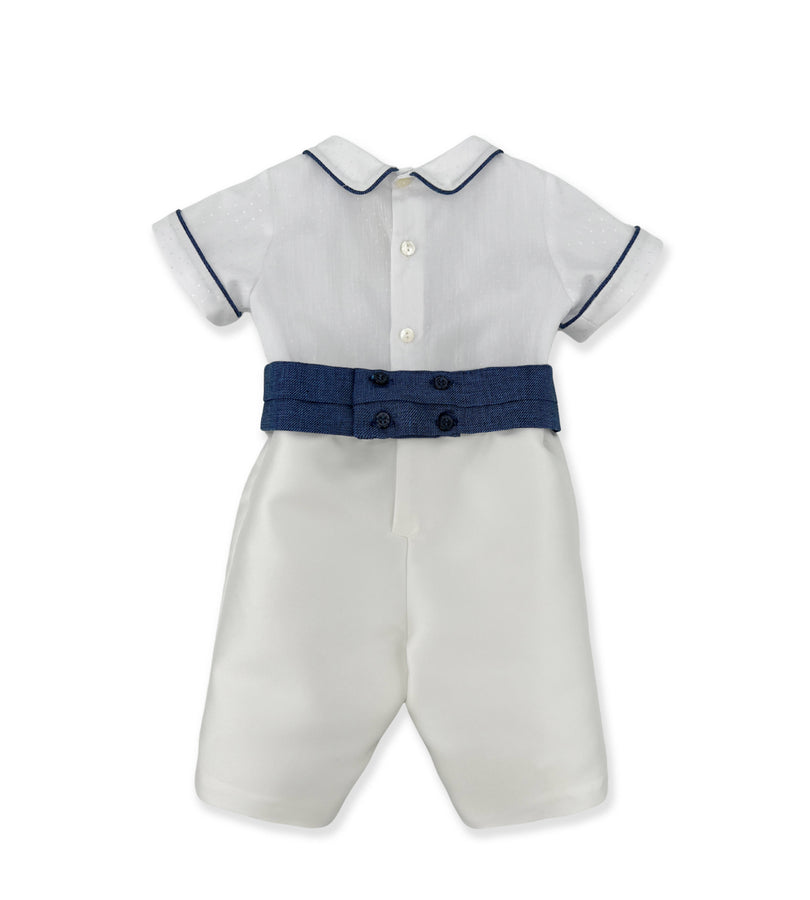 White romper with cotton shirt with white silk mikado shorts made unique by the blue melange linen profiles and details, invisible opening with automatic buttons and pure cotton lining