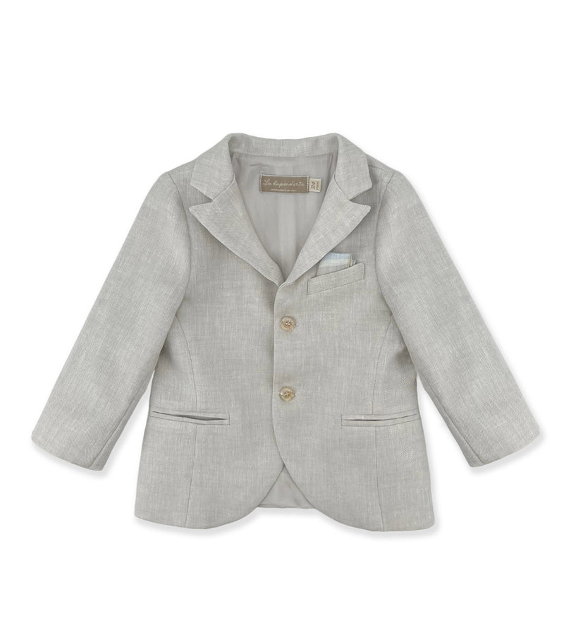 Beige pure linen jacket with light blue striped pocket square and handkerchief