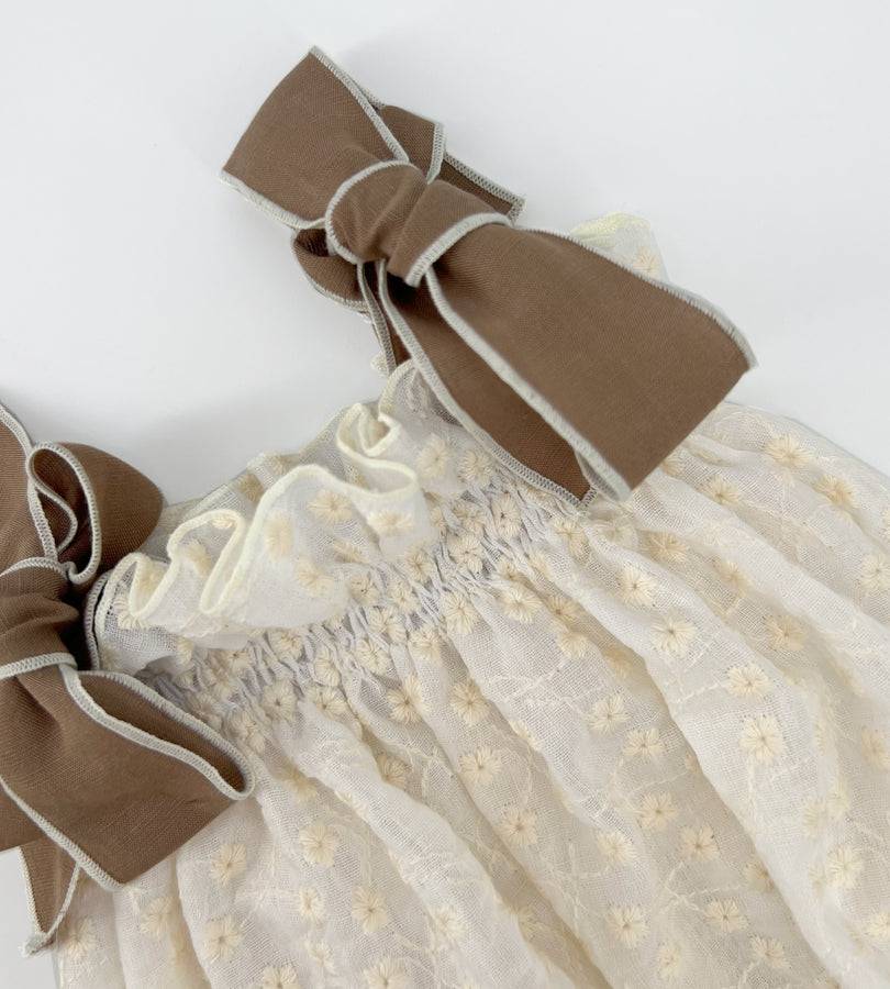 Cute romper in cream cotton with embroidered flowers, elastic yoke and chocolate-coloured shoulder straps