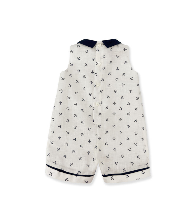 Fun white linen with blue anchors for the romper with pence and lined in pure cotton