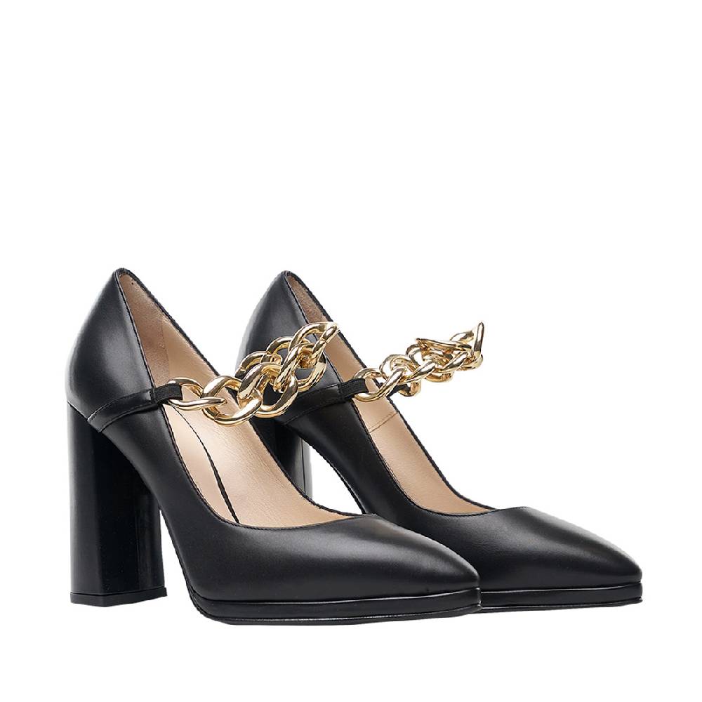 Una decollette diversa e dal gusto rock grazie al total black e alla catena dorata che impreziosisce l’insieme. La forma del tacco è studiata per “osare” con comodità anche grazie al piccolo plateau in punta. Perfetta per sentirsi uniche e speciali.