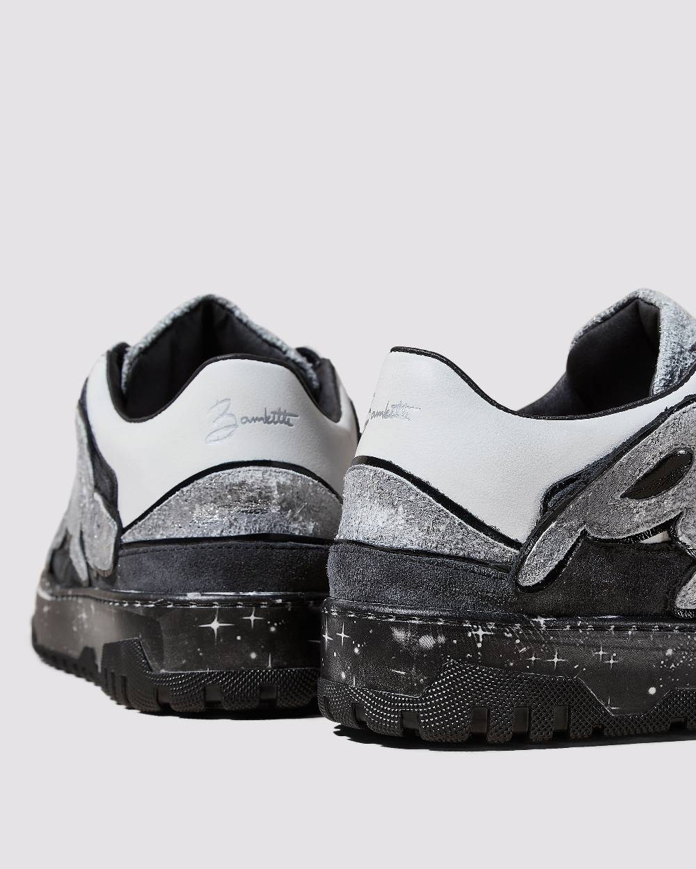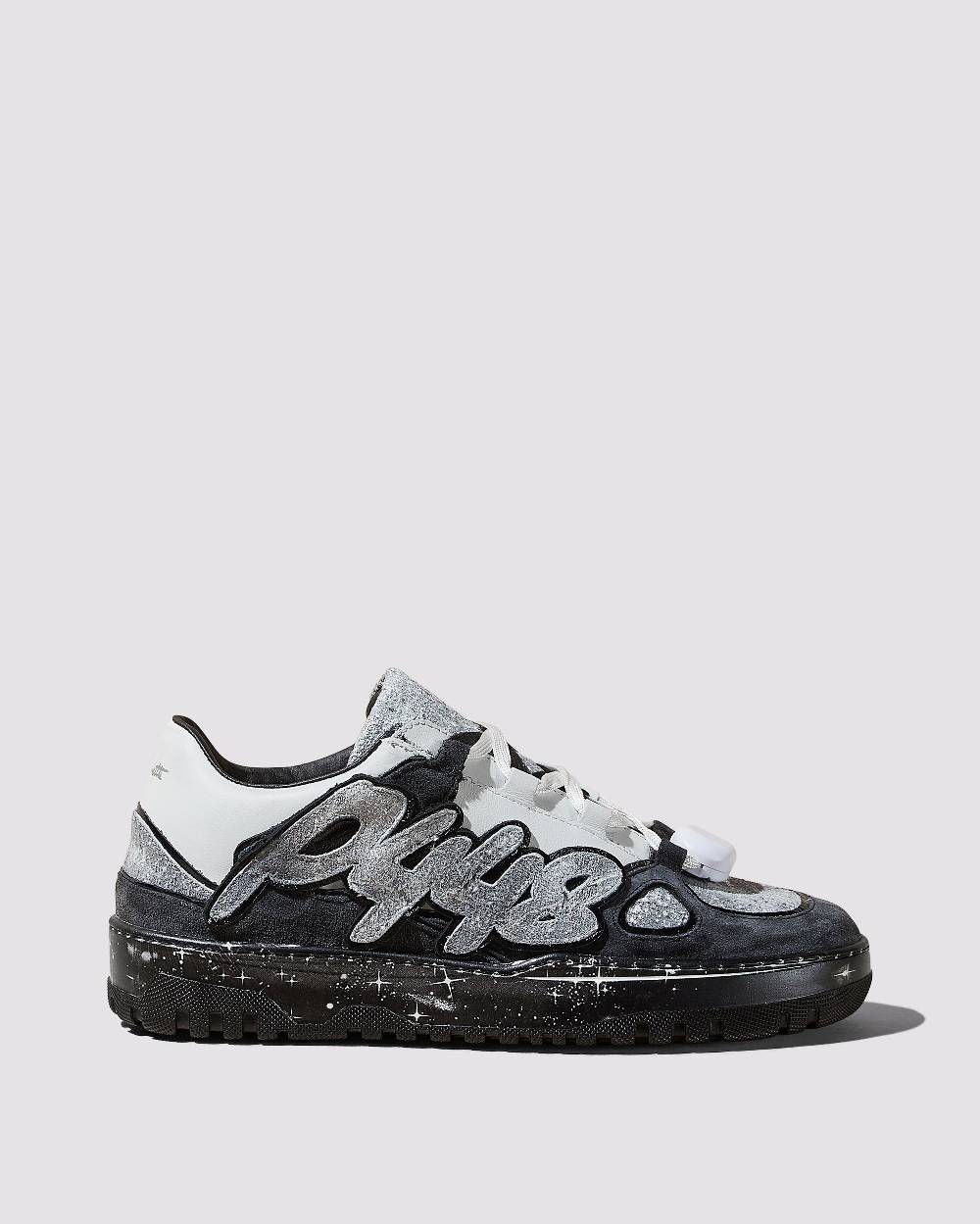 In the George Stella, P448 Brand Instigator, AKA Olympic skateboarder Bombette Martin, opted for a galaxy-inspired palette with a modern twist. Black suede and white leather keep the look grounded, while the graffitied P448 logo, silver leather details, black constellation sole, and LED laces bring Bombette’s strikingly cool style to life.