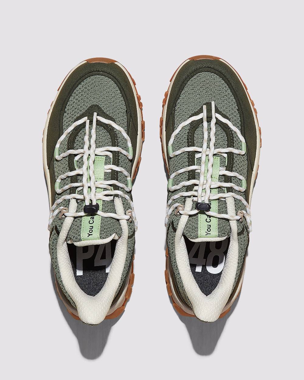 Lace up in the P448 x Vibram Monalea Jalapeno for performance details and sustainable style. Made from our next expedition into biobased and sustainable materials, this hiker-style pair features a green recycled knit design and a forest green microfiber wavy trim, brightened by an off-white Vibram Natural EVA midsole and a rugged black Vibram Ecostep Natural outsole. The quick-lacing bungee feature and top reinforced eyelet are our version of sport mode.