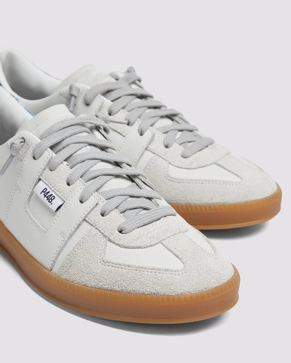 The Monza Dusk is wrapped in white leather with an off-white suede tongue and trim, all accented by a blue snakeskin-printed leather heel tab. Grey cotton laces and the signature amber rubber sole complete the look.