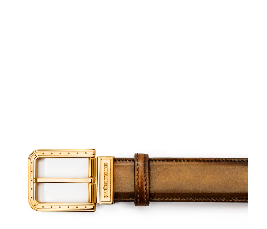 Si ispira alla bellezza autentica di un secolo di tradizione artigianale di famiglia questa cintura maschile in vitello dipinto a mano, per un'esperienza di lusso tutta italiana. La raffinata finitura del pellame, anticato a mano nei toni del marrone, crea effetti cromatici vibranti e una lucentezza senza pari, capaci di esaltare l'eleganza di questo accessorio di classe. La fibbia gioiello RIPA, realizzata in ottone pieno scavato a fresa, microforato e galvanizzato in color oro, è rimovibile e intercambiabile per molteplici combinazioni di stile. Confortevole vestibilità e supporto perfetto grazie al vitello di alta qualità, alto 3,5 cm, con fodera in vera pelle, capace di assicurare flessibilità e resistenza. Design esclusivo, materiali pregiati e lavorazioni curate nei minimi dettagli da maestri artigiani fiorentini: queste le caratteristiche di una preziosa collezione di cinture Made in Italy, sintesi eccellente fra le esperienze produttive nella moda in pelle e nelle lavorazioni artistiche dell'ottone. Scopri online anche le altre varianti colore della cintura RIPA da abbinare alle calzature Pakerson a tinte coordinate.