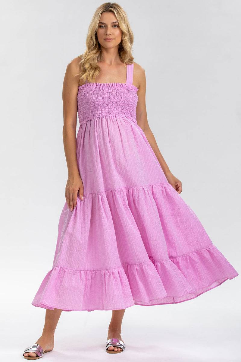 Abito premaman realizzato a balze con corpetto in punto smock elasticizzato che garantisce il massimo comfort e vestibilità al livello del seno. Lunghezza maxi e fluidità data dal tessuto fresco rendono l'abito perfetto per la tua estate.