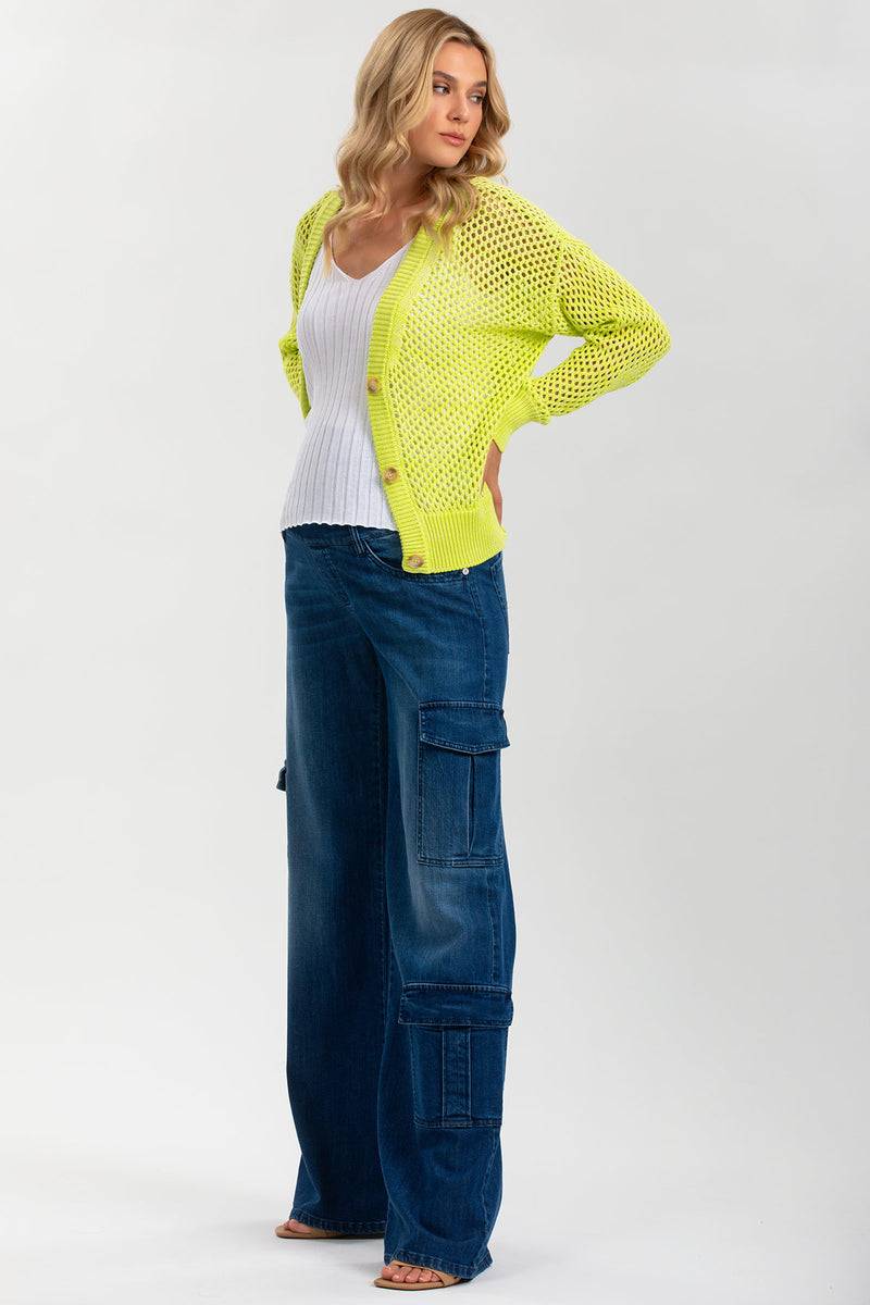 Cardigan premaman a rete con maniche lunghe e spalla scesa. Questa trama con effetto semi-trasparente lo rende molto confortevole e adattabile nella vestibilità grazie anche al filato che è particolarmente morbido. Scollo a V e chiusura con bottoni lo rendono facile da indossare. Perfetto per un look casual chic. Completa il look top con il top BLONDIE.