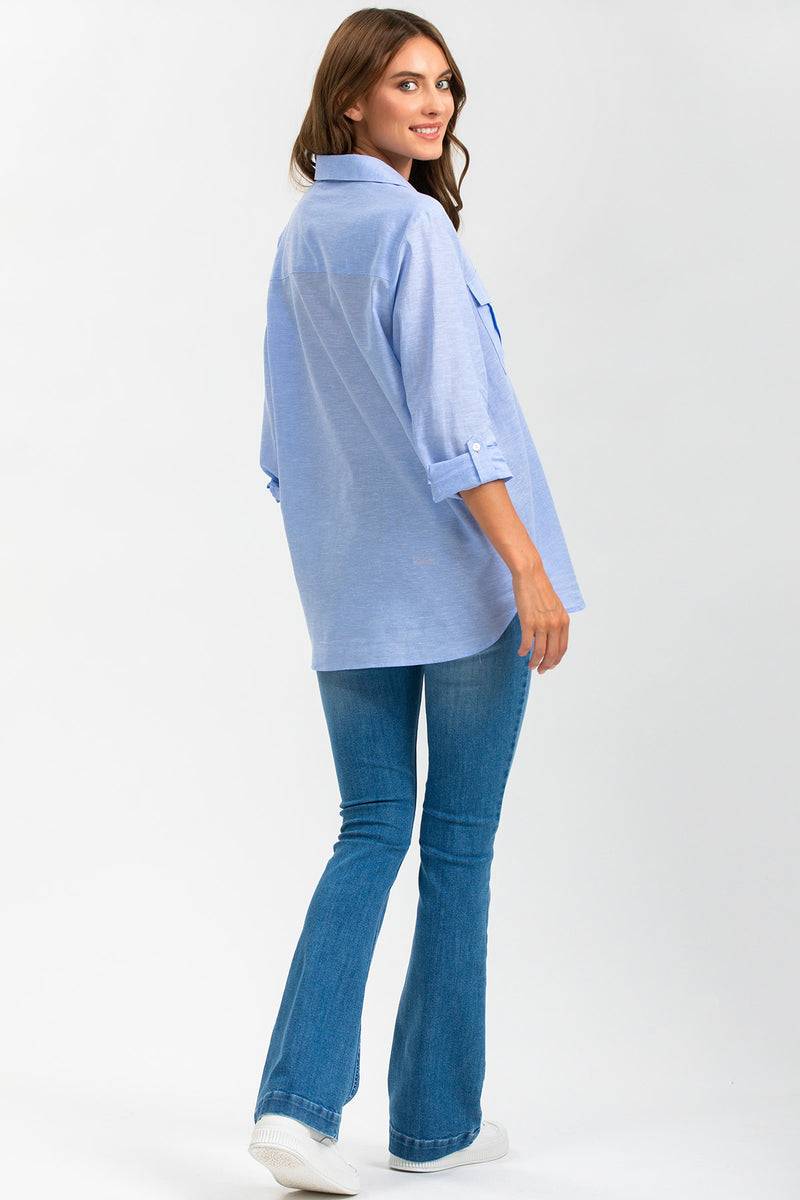 Camicia premaman stile utility in misto lino con tasche frontali. Maniche lunghe con fascetta e bottone che danno la possibilità di rimboccare le maniche e fissarle col bottone all'altezza desiderata. La camicia SAFARI è perfetta per il lavoro e per un look casual chic sempre preciso ed elegante.
