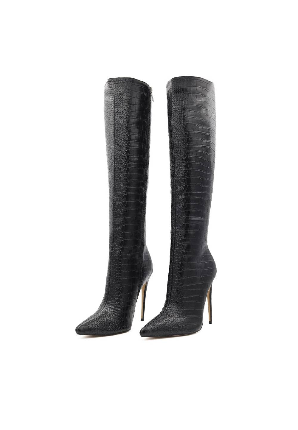 Stivali da donna con tacco 12 cm realizzati in ecopelle in finitura liscia o effetto coccodrillo. Altezza del gambale 40 cm. Calzata regolare.