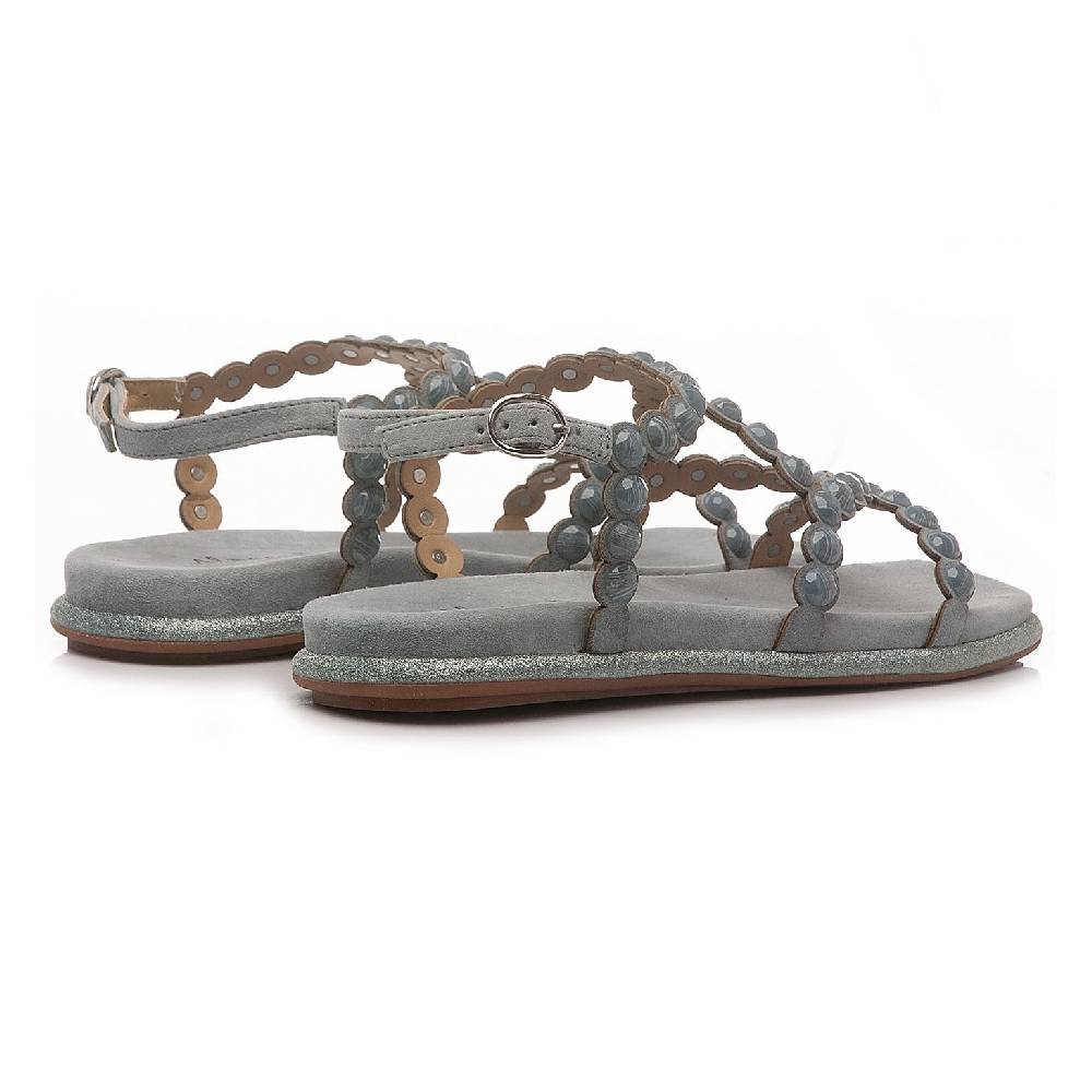Sandali da donna Alma en Pena fatti in pelle scamosciata decorati con pietre. Colore celeste. Fondo in gomma. Comodi ed casual.