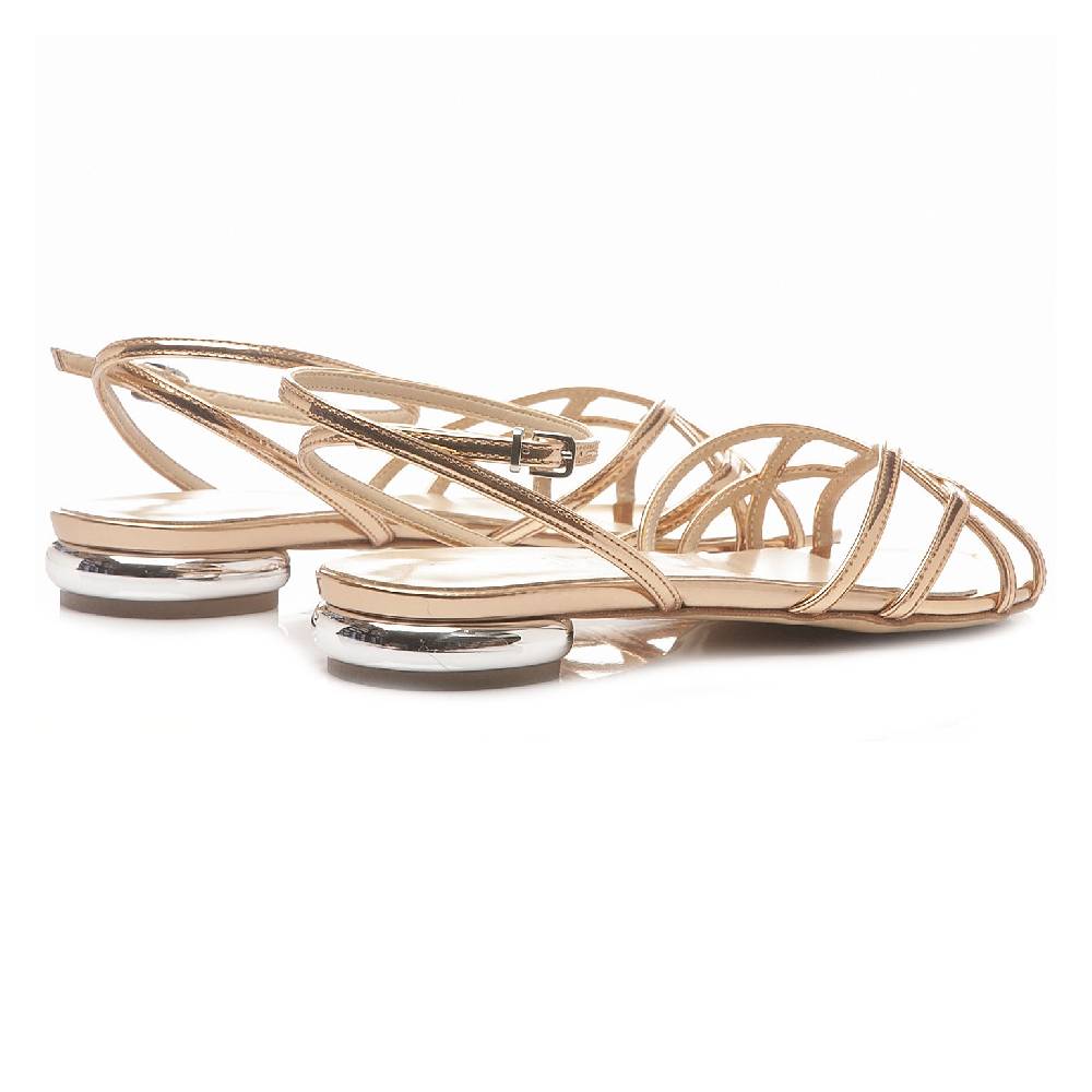 Sandali da donna NCUB modello STICH 90 fatti in pelle con cinturino alla caviglia. Colore rosa laminato. Tacco basso 1cm, fondo in cuoio. Comodi ed eleganti.