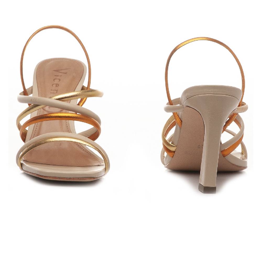 Sandali da donna Vicenza modello 1598006-3 fatti in pelle. Colore beige ed oro. Tacco alto 9cm, fondo in cuoio. Comodi ed eleganti.