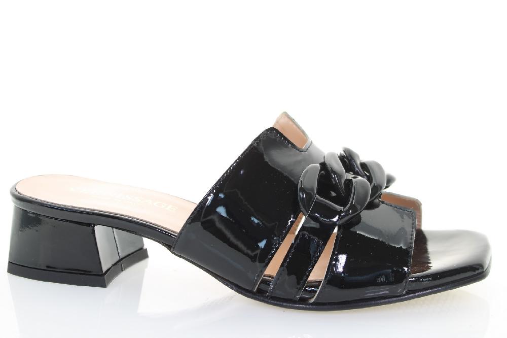 Ciabatta in pelle effetto vernice con accessorio catena, fodera e sottopiede pelle, suola in vero cuoio, tacco ricoperto in pelle effetto vernice altezza cm 3,5. Made in Italy