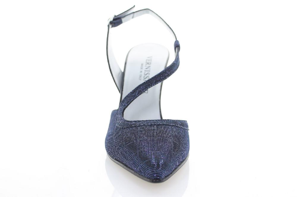Décolleté semi aperta in tessuto effetto glitter, cinturino regolabile con fibbia, fodera e sottopiede pelle, suola in vero cuoio, tacco laccato altezza cm 9. Made in Italy