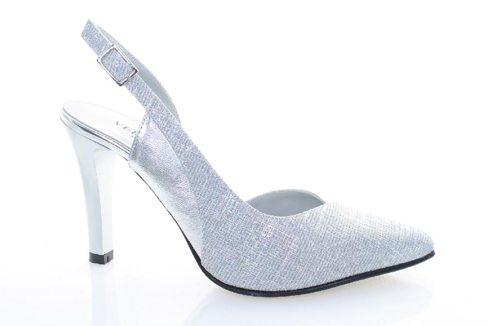 Décolleté semi aperta in tessuto effetto glitter e pelle laminata, cinturino regolabile con fibbia, fodera e sottopiede pelle, suola in vero cuoio, tacco laccato altezza cm 9. Made in Italy