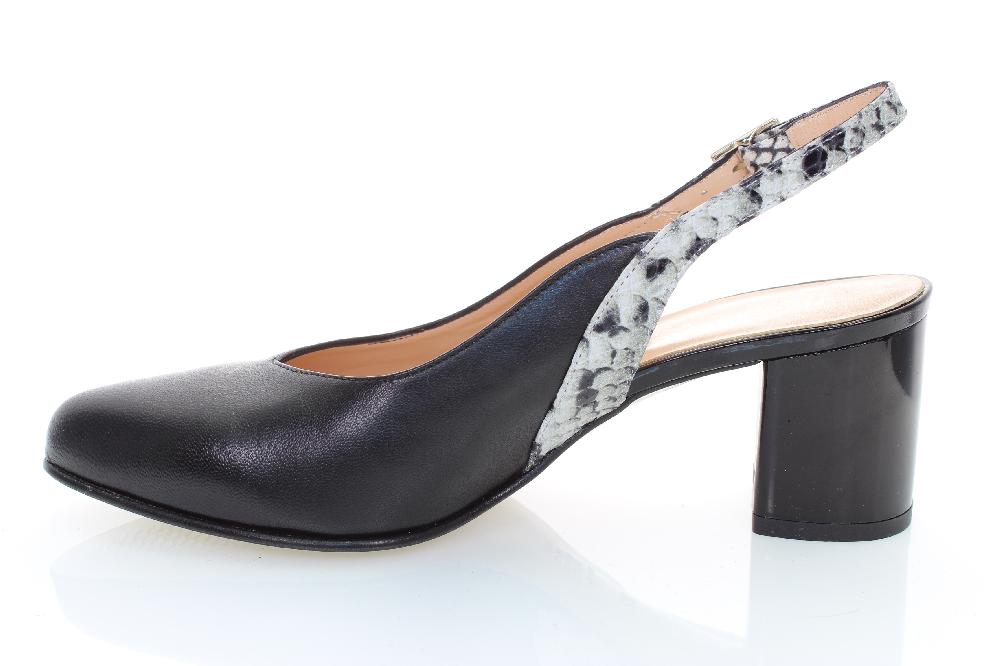 Décolleté semi aperta a punta rotonda in pelle nappata con inserto in pelle stampa pitone, cinturino regolabile con fibbia metallica, fodera e sottopiede in pelle, suola in vero cuoio e tacco laccato 6 cm. Made in Italy