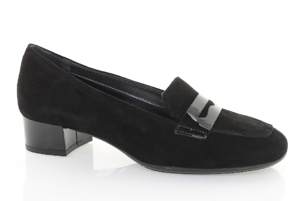 Mocassino in pelle scamosciata con inserito in vernice, fodera in tessuto maglina e pelle, sottopiede pelle, suola in altri materiali, tacco laccato altezza cm 3,5. Made in Italy