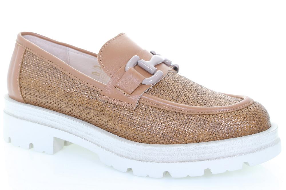 Mocassino in tessuto rafia e pelle nappata arricchito da morsetto ornamentale, fodera e sottopiede pelle, soletta in Memory Foam, fondo in altri materiali altezza 4,5 cm. 100 % Made in Italy