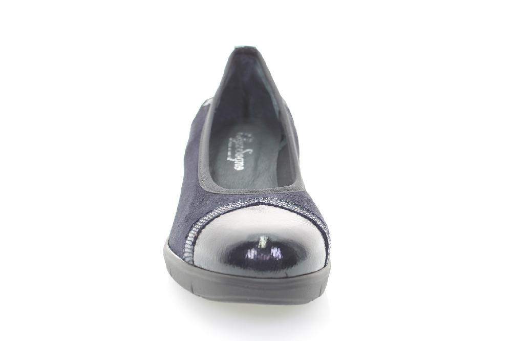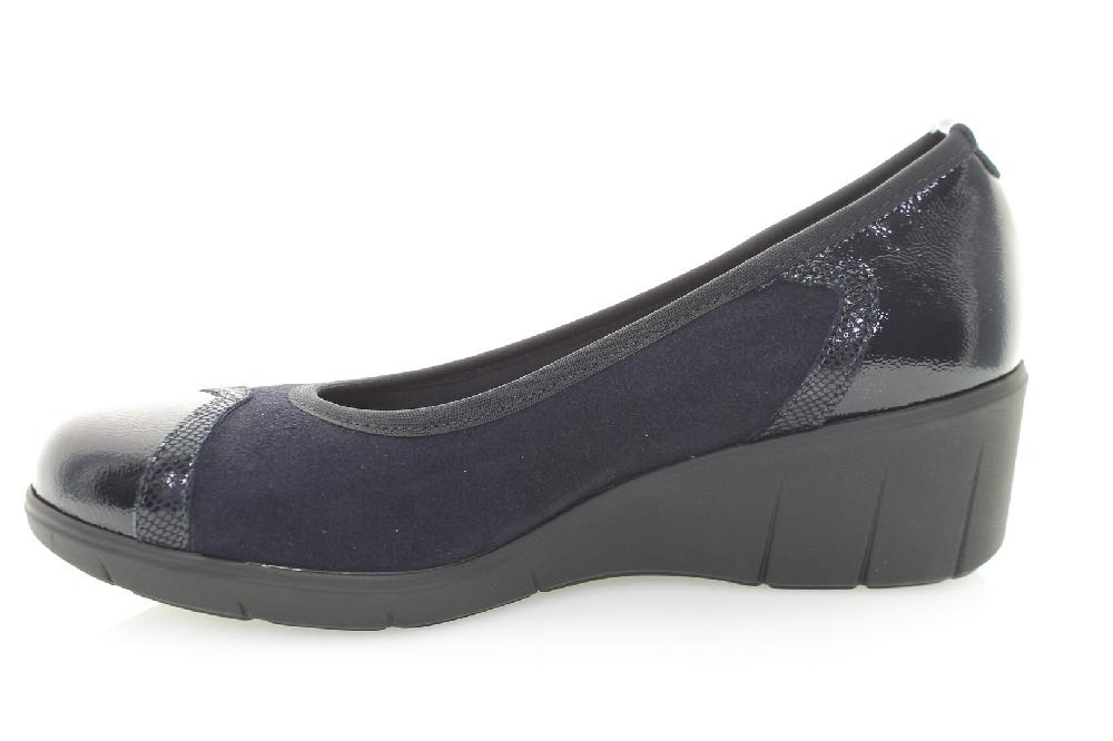 Scarpa in pelle scamosciata con punta e tallone in pelle effetto vernice, scollo con bordino elastico, fodera in tessuto maglina e pelle, sottopiede pelle, fondo in altri materiali altezza cm 5. Made in Italy